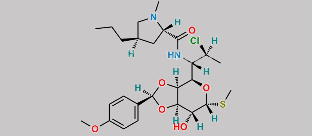 Anisylidene Clindamycin is chemically (2S,4R)-N-((1S,2S)-2-Chloro-1-((2R,3aS,4R,6R,7R,7aR)-7-hydroxy-2-(4-methoxyphenyl)-6-(methylthio)tetrahydro-4H-[1,3]dioxolo[4,5-c]pyran-4-yl)propyl)-1-methyl-4-propylpyrrolidine-2-carboxamide. Anisylidene Clindamycin is supplied with detailed characterization data compliant with regulatory guideline. Anisylidene Clindamycin can be used for the analytical method development, method validation (AMV), Quality Controlled (QC) application for Abbreviated New Drug Application (ANDA) or during commercial production of Clindamycin. The product can be used as reference standards and further traceability against pharmacopeial standards (USP or EP) can be provided based on feasibility. ChemWhat products are for analytical purpose only and not for human use.