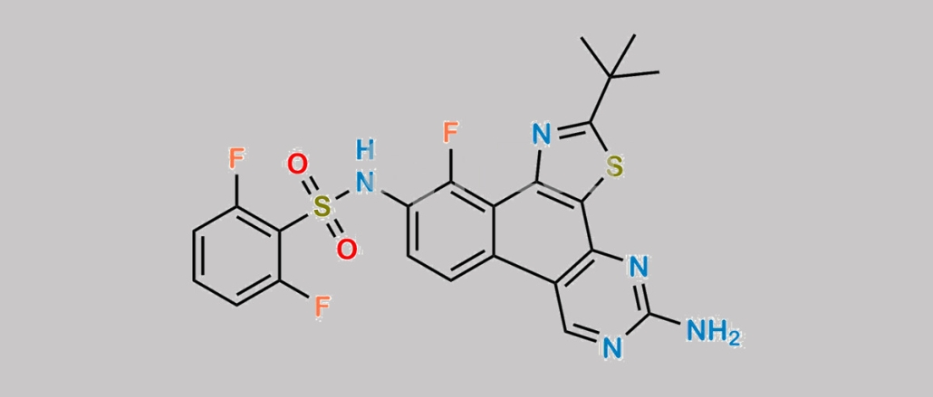 Dabrafenib Impurity 15 is chemically N-(5-Amino-2-(tert-butyl)-11-fluorobenzo[f]thiazolo[4,5-h]quinazolin-10-yl)-2,6-difluorobenzenesulfonamide. Dabrafenib Impurity 15 is supplied with detailed characterization data compliant with regulatory guideline. Dabrafenib Impurity 15 can be used for the analytical method development, method validation (AMV), Quality Controlled (QC) application for Abbreviated New Drug Application (ANDA) or during commercial production of Dabrafenib. The product can be used as reference standards and further traceability against pharmacopeial standards (USP or EP) can be provided based on feasibility. ChemWhat products are for analytical purpose only and not for human use.