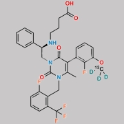 Elagolix Dialkylated Impurity is chemically (R)-4,4'-((2-(5-(2-Fluoro-3-methoxyphenyl)-3-(2-fluoro-6-(trifluoromethyl)benzyl)-4-methyl-2,6-dioxo-3,6-dihydropyrimidin-1(2H)-yl)-1-phenylethyl)azanediyl)dibutyric acid. Elagolix Dialkylated Impurity is supplied with detailed characterization data compliant with regulatory guideline. Elagolix Dialkylated Impurity can be used for the analytical method development, method validation (AMV), Quality Controlled (QC) application for Abbreviated New Drug Application (ANDA) or during commercial production of Elagolix sodium. The product can be used as reference standards and further traceability against pharmacopeial standards (USP or EP) can be provided based on feasibility. ChemWhat products are for analytical purpose only and not for human use.