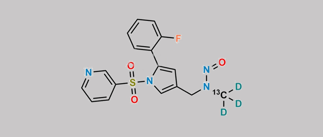 N-Nitroso Vonoprazan-13CD3 is chemically N-((5-(2-Fluorophenyl)-1-(pyridin-3-ylsulfonyl)-1H-pyrrol-3-yl)methyl)-N-(methyl-13C-d3)nitrous amide. N-Nitroso Vonoprazan-13CD3 is supplied with detailed characterization data compliant with regulatory guideline. N-Nitroso Vonoprazan-13CD3 can be used for the analytical method development, method validation (AMV), Quality Controlled (QC) application for Abbreviated New Drug Application (ANDA) or during commercial production of Vonoprazan. The product can be used as reference standards and further traceability against pharmacopeial standards (USP or EP) can be provided based on feasibility. ChemWhat products are for analytical purpose only and not for human use.