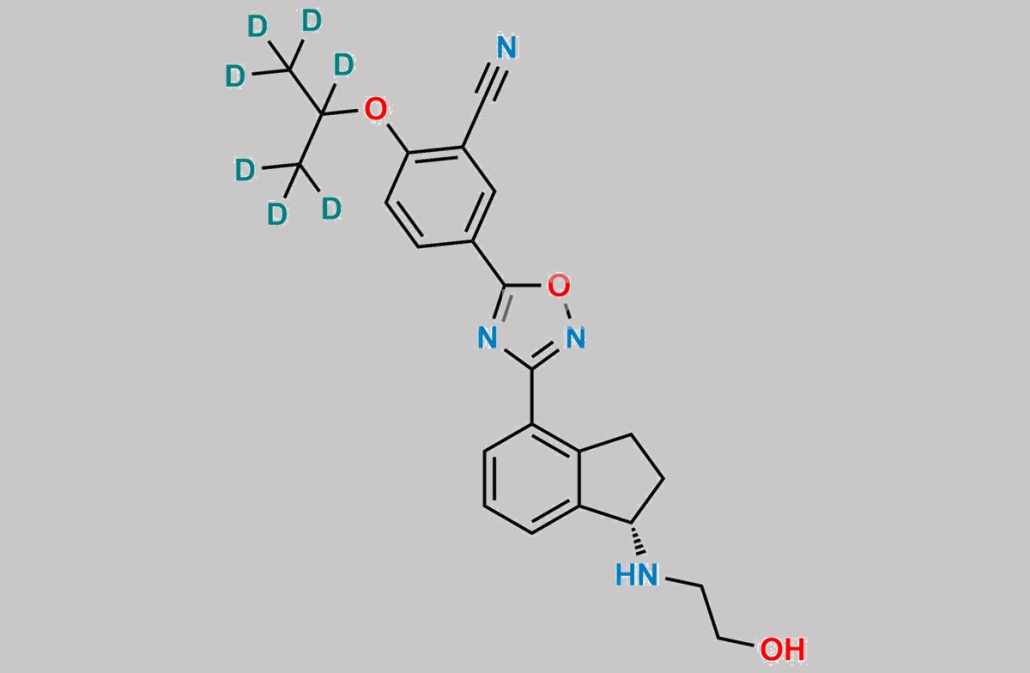 Ozanimod D7 is chemically (S)-5-(3-(1-((2-Hydroxyethyl)amino)-2,3-dihydro-1H-inden-4-yl)-1,2,4-oxadiazol-5-yl)-2-((propan-2-yl-d7)oxy)benzonitrile. Ozanimod D7 is supplied with detailed characterization data compliant with regulatory guideline. Ozanimod D7 can be used for the analytical method development, method validation (AMV), Quality Controlled (QC) application for Abbreviated New Drug Application (ANDA) or during commercial production of Ozanimod. The product can be used as reference standards and further traceability against pharmacopeial standards (USP or EP) can be provided based on feasibility. ChemWhat products are for analytical purpose only and not for human use.