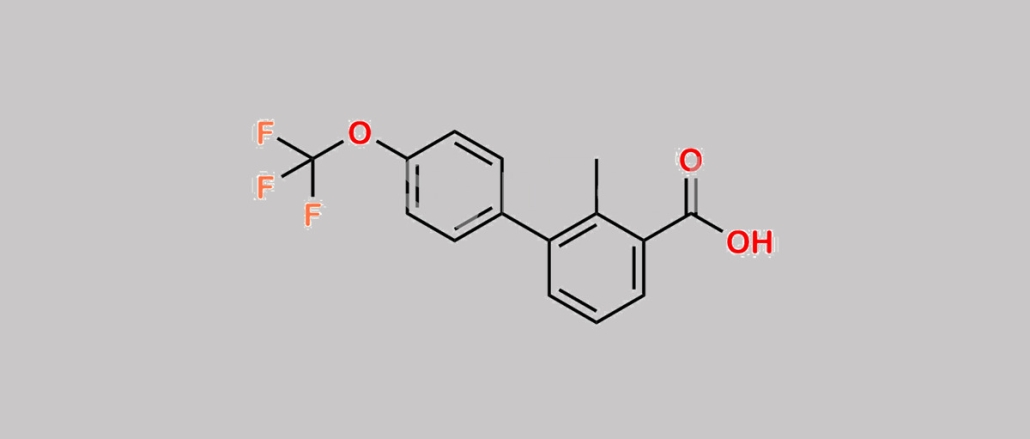 Sonidegib Impurity 1 is chemically 2-Methyl-4'-(trifluoromethoxy)-[1,1'-biphenyl]-3-carboxylic acid. Sonidegib Impurity 1 is supplied with detailed characterization data compliant with regulatory guideline. Sonidegib Impurity 1 can be used for the analytical method development, method validation (AMV), Quality Controlled (QC) application for Abbreviated New Drug Application (ANDA) or during commercial production of Sonidegib. The product can be used as reference standards and further traceability against pharmacopeial standards (USP or EP) can be provided based on feasibility. ChemWhat products are for analytical purpose only and not for human use.