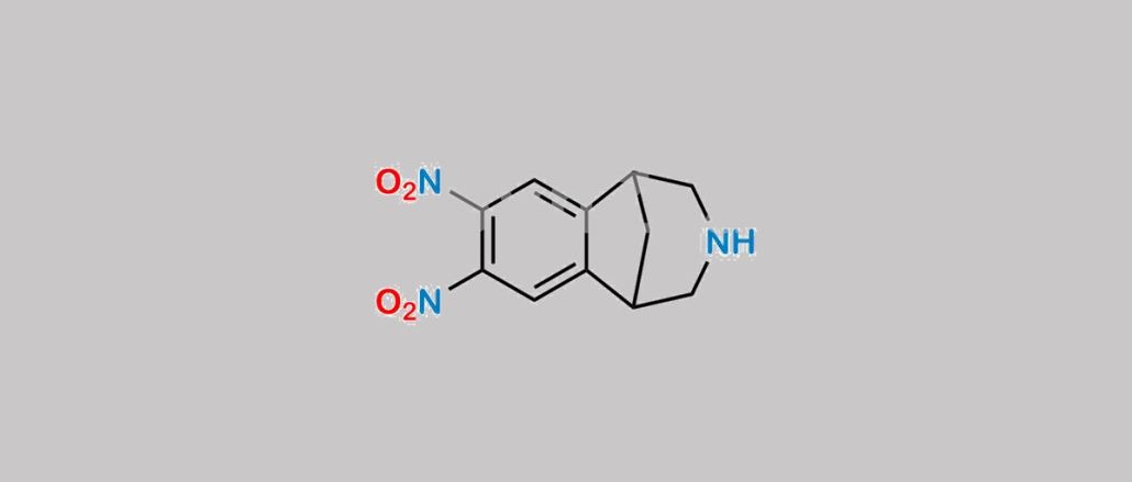 Varenicline Impurity 2 is chemically 7,8-Dinitro-2,3,4,5-tetrahydro-1H-1,5-methanobenzo[d]azepine. Varenicline Impurity 2 is supplied with detailed characterization data compliant with regulatory guideline. Varenicline Impurity 2 can be used for the analytical method development, method validation (AMV), Quality Controlled (QC) application for Abbreviated New Drug Application (ANDA) or during commercial production of Varenicline. The product can be used as reference standards and further traceability against pharmacopeial standards (USP or EP) can be provided based on feasibility. ChemWhat products are for analytical purpose only and not for human use.